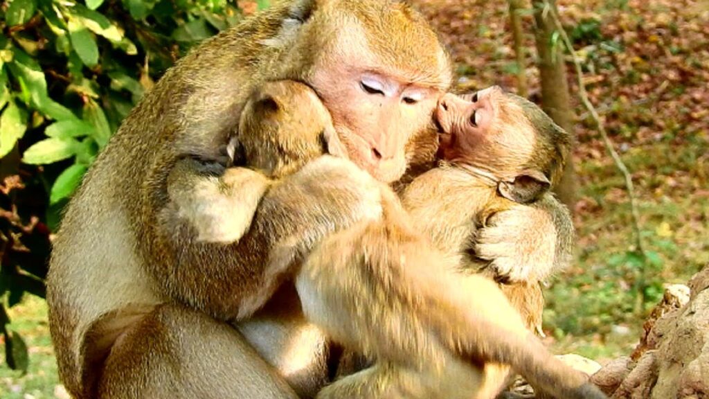 Not far away, two tiny baby monkeys watched from the safety of a low branch. Their eyes were bright, curious, and uncertain. One of them leaned forward, then pulled back, unsure whether this human figure was friend or stranger.