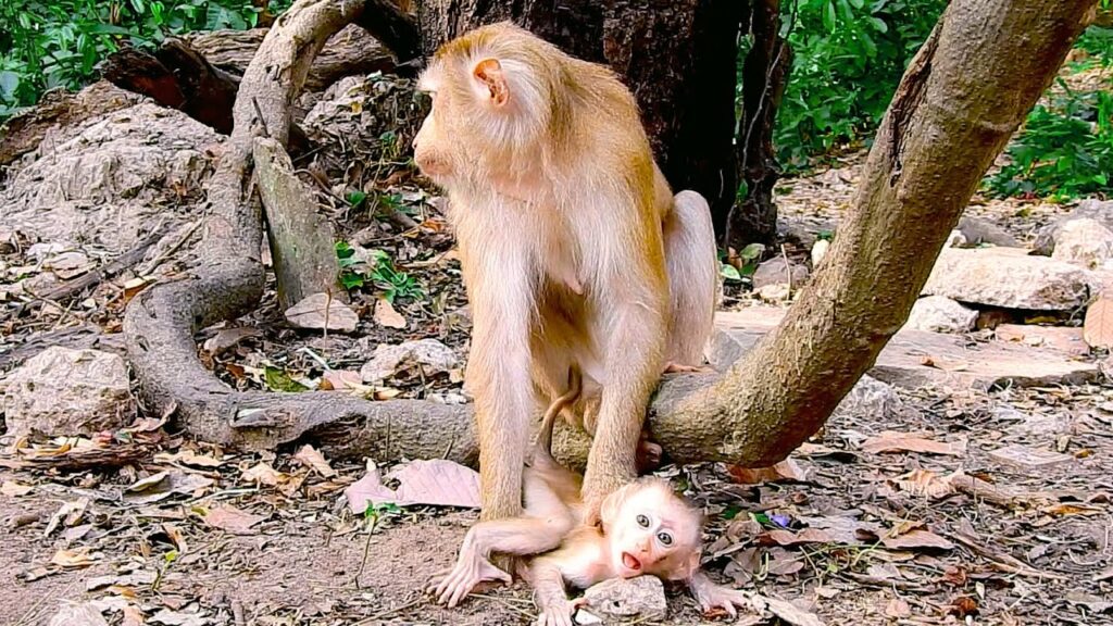 The morning air in the Angkor Wat forest carried a quiet stillness, broken only by the soft rustling of leaves overhead. I had been watching the troop for nearly an hour when I noticed her—thin, slower than the others, moving with a kind of quiet effort that didn’t go unnoticed.