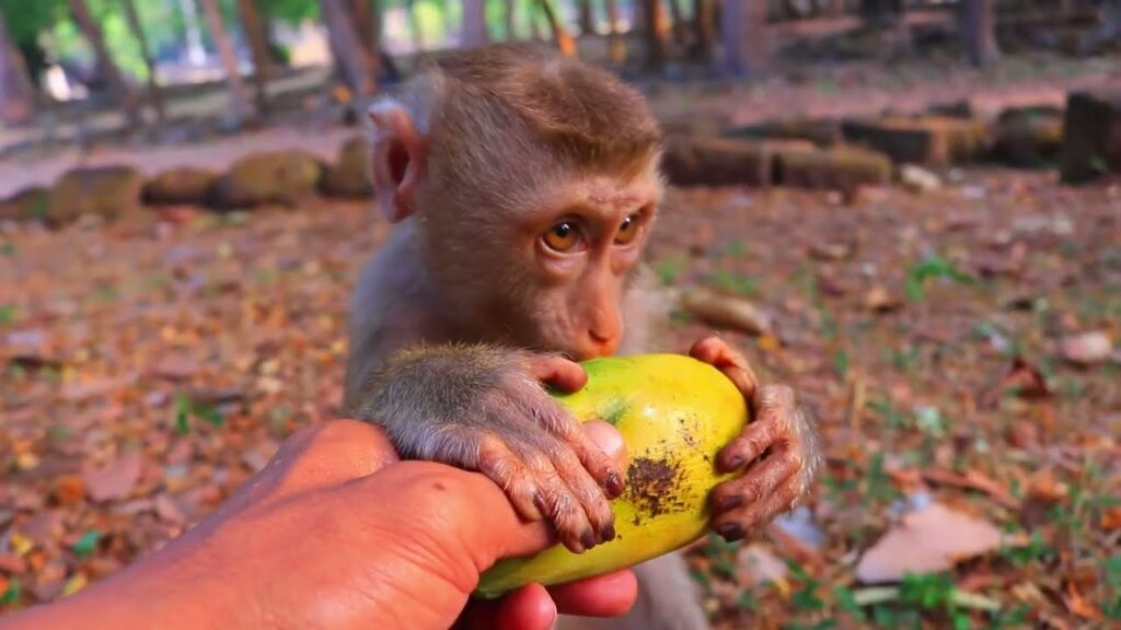 Then came a smaller monkey—hesitant, slower, clearly not as strong. It paused just within reach, eyes fixed on the mango. Molly noticed. She shifted, then broke off a small piece. Not rushed, not dramatic—just deliberate.