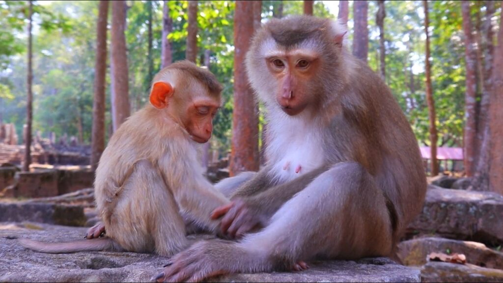 The morning light settled softly across the stones of the Angkor Wat forest, where the troop moved without urgency. Near the roots of a fig tree, a young monkey leaned in close to her mother, fingers parting fur with careful attention.