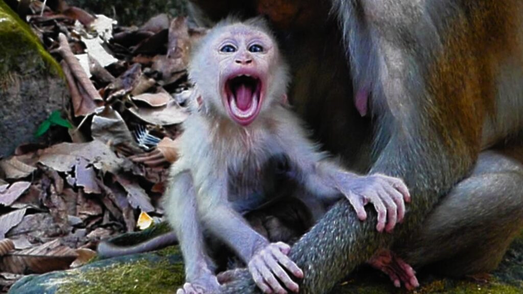 The morning light filtered softly through the tall trees of Angkor Wat, settling gently on the forest floor. A small monkey sat alone near a worn stone path, his body still, his eyes searching.
