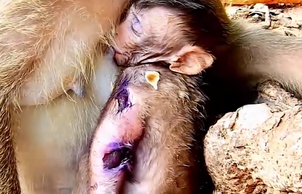 Morning light moved slowly through the Angkor Wat forest, casting long shadows across the stone paths where small monkey families gathered. Near a quiet temple wall, a young monkey named Lola sat alone beneath a low branch. She usually climbed quickly, but that morning her movement seemed careful and slow.