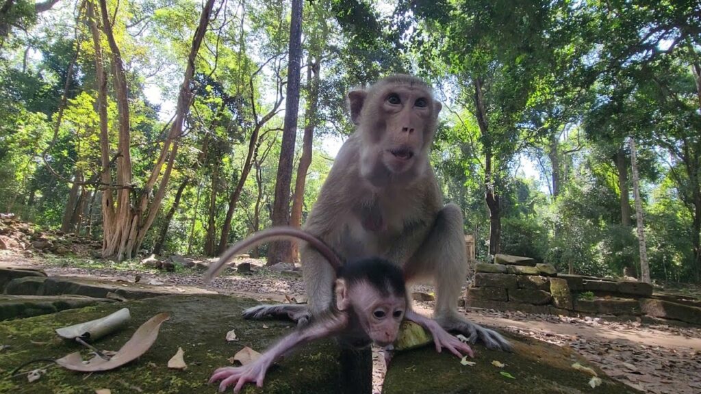 As the mango disappeared, Evian leaned against Elpida, and she rested her head briefly on his arm. In that ancient forest, among ruins and roots, I didn’t just witness baby monkeys eating fruit. I witnessed the purest form of generosity — and it stayed with me long after they climbed back into the trees.