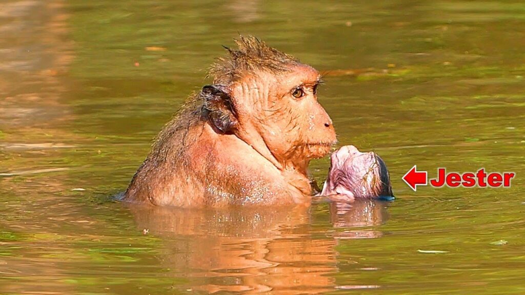 The morning light filtered softly through the tall trees of the Angkor Wat forest, reflecting gently across a wide, still pond. That was where Mother Jinx stepped carefully into the water, her movements slow and deliberate. In her arms was baby Jester—small, quiet, and clearly unsure of the unfamiliar cold surrounding him.