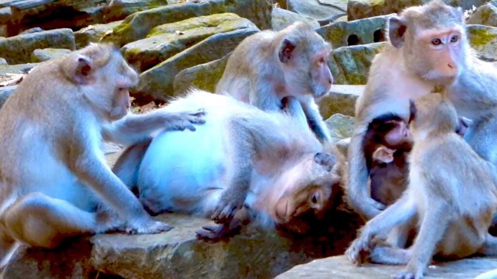 At the center of the group sat the large adult monkeys, their presence steady and watchful. They moved slowly, carefully, as if aware that the smallest lives among them needed peace more than protection. Clinging to their mothers’ chests were the babies—tiny, warm, and still learning the world through touch and sound.