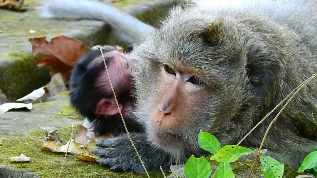 A young baby monkey lies beneath his mother, her weight resting comfortably for her, but not quite so for him. His tiny arms shift, his legs wiggle, and then he pauses. There’s no panic. No cry. Just a soft, patient attempt to move.