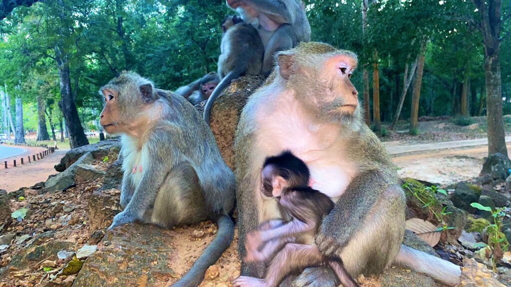 The forest near Angkor Wat wakes slowly. Morning light drifts through tall trees, settling softly on stone roots and winding paths. It was here, on one of those calm mornings, that I noticed a baby monkey sitting close to its mother, simply watching the world begin.
