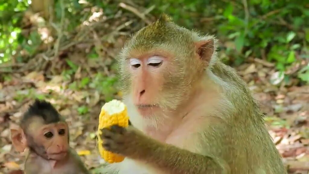 In the soft, golden light of the Angkor Wat forest, the air hummed with birdsong, and the distant sound of rustling leaves set the stage for a quiet, yet unforgettable moment. Baby Cinn Crabs, barely a few months old, clung to the edge of a mossy tree trunk, eyes wide and filled with hunger. His tiny stomach grumbled as he watched his mother, Cruella, savoring a bright yellow ear of corn she had found moments earlier.