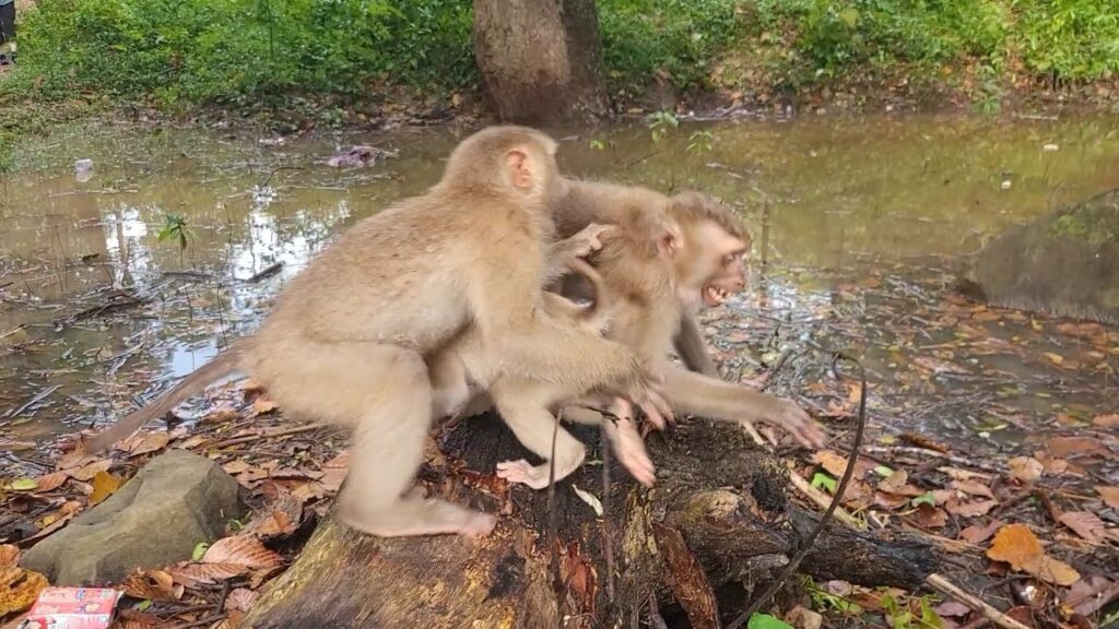 The forest near Angkor Wat was unusually calm that morning. Sunlight filtered through the tall trees in soft, broken lines, and the air carried the gentle sounds of birds and distant movement. On a low branch, a young monkey sat still—more still than usual—with his little brother pressed closely against his side.
