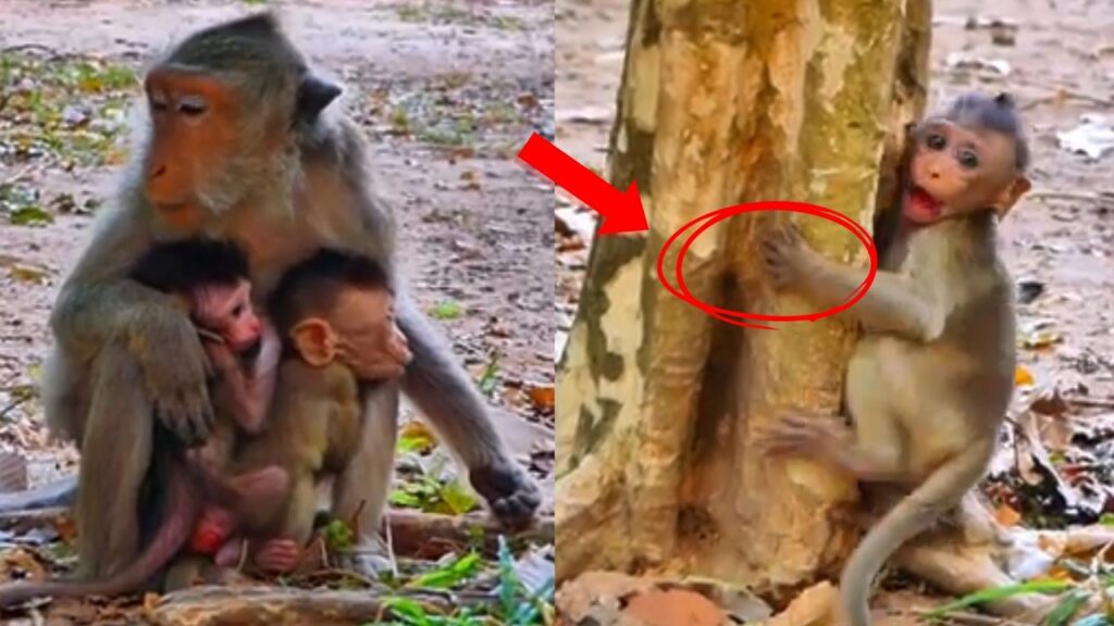 The mother sat calmly, her back against the stone, arms wrapped around another young monkey who had climbed into her lap. It wasn’t dramatic or rushed—just a quiet moment of closeness. But a few steps away, a smaller baby watched closely.