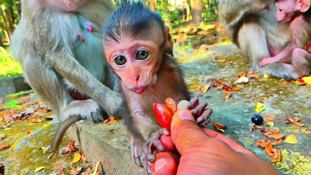 The morning light filtered softly through the tall trees of the Angkor Wat forest, turning the air warm and calm. I was sitting quietly when I noticed the smallest movement near the roots of a fig tree—a baby monkey, barely steady on his feet, holding a piece of fruit almost as big as his tiny hands.