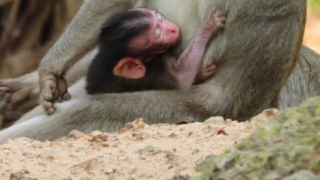 In the quiet heart of the Angkor Wat forest, where sunlight filters softly through the ancient trees, a small drama unfolds—a scene so tender it pulls at your heart. On a moss-covered branch, a newly crowned monkey queen sits, her eyes alert yet anxious, holding her tiny newborn close. The little one, with fur still damp from birth, stretches its delicate arms toward her, searching for the warmth and sustenance that only she can provide.