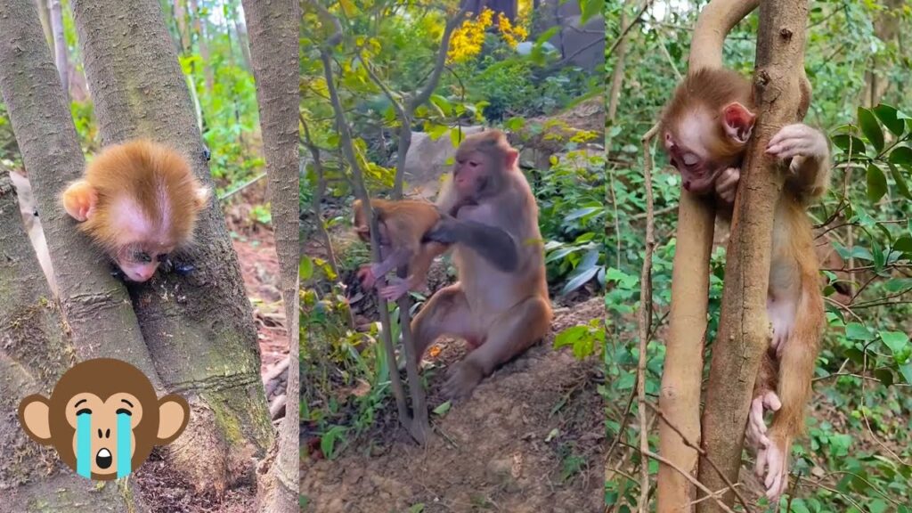 Little Miko, a mischievous baby monkey no bigger than a soft pouch of leaves, had been exploring a tall tree, chattering excitedly as he clambered higher and higher. His tiny hands grasped branches with fearless curiosity, his small feet testing each limb. But adventure, as it often does, comes with risks. A sudden snap under his weight sent him tumbling, and he found himself stuck between two thick branches, dangling helplessly.