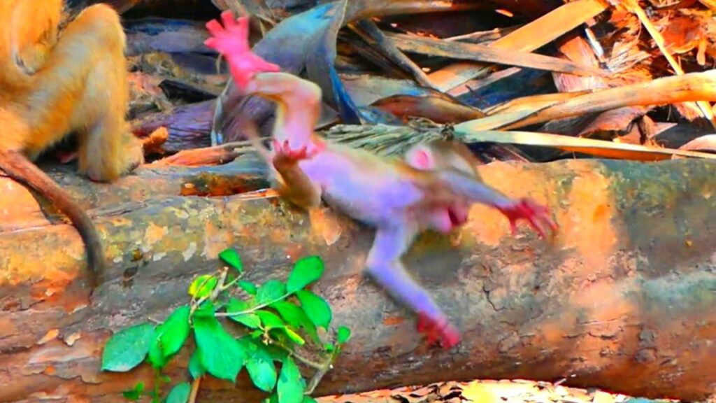 Another young monkey climbed down from a nearby branch, curious about the tiny newcomer. It crept closer, head tilted with interest.