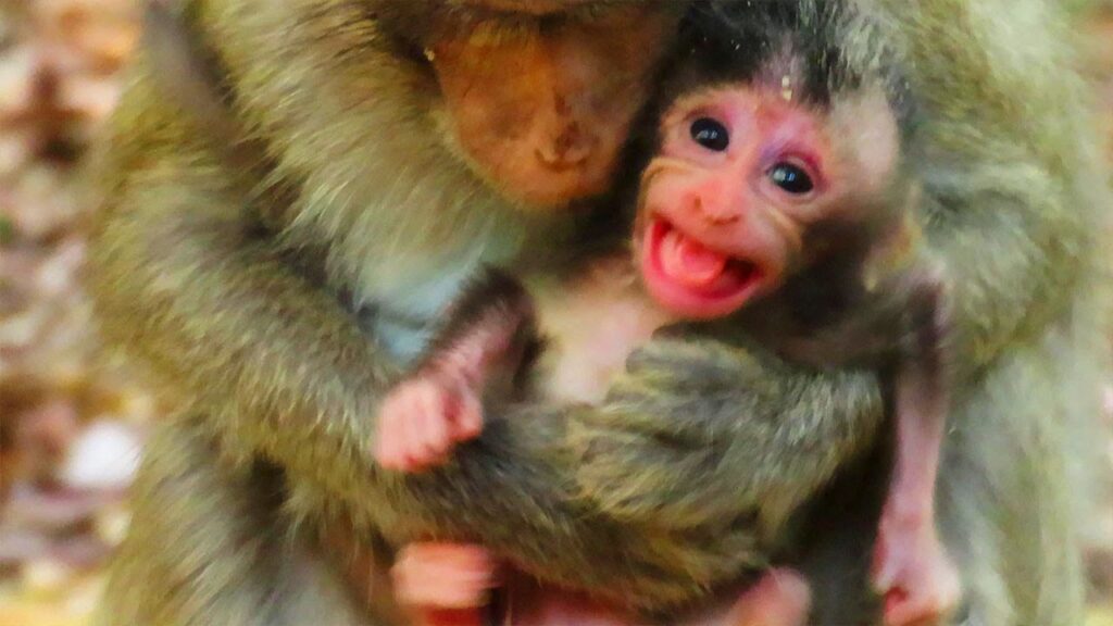 The forest beneath Angkor Wat was unusually still that morning. Sunlight filtered through the high branches, landing softly on moss-covered stones and winding roots that had held centuries of footsteps. In that quiet space, a very small baby monkey clung to its mother’s side, pressing close in a way that felt more hopeful than certain.