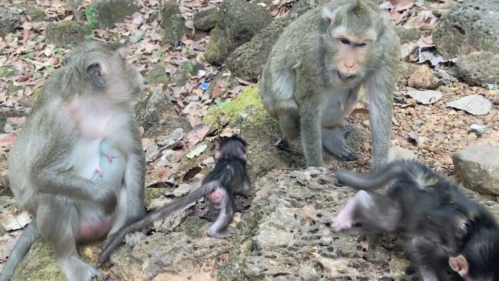 The forest was already awake, but quietly so. Morning light filtered through the tall trees near Angkor Wat, brushing the stone ruins with a soft gold that felt almost deliberate. I noticed them just beyond a line of roots—one mother monkey resting against the trunk, her baby pressed close to her chest.