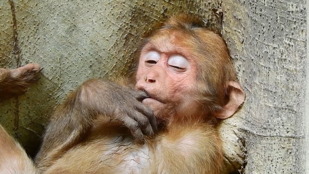 The forest was already awake, but one small life seemed to be drifting somewhere between night and morning. High above the roots and fallen leaves, a young monkey rested against the curve of a tree branch, his body folded in a way that looked more hopeful than comfortable.