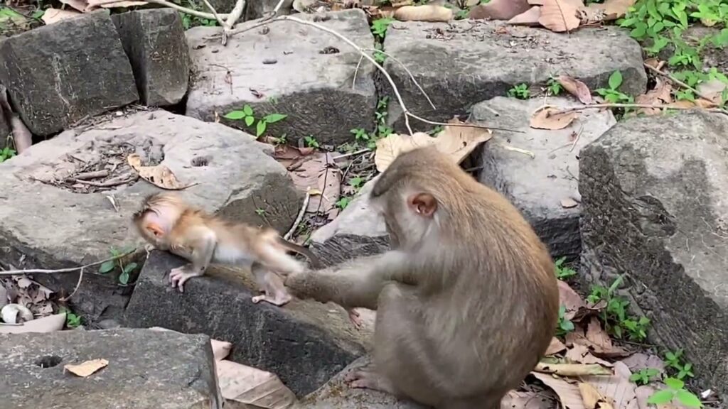 As the sun rose higher, more monkeys appeared, crossing paths without urgency. Some groomed each other beneath broken stones. Others sat alone, gazing into the forest like thoughtful elders. A baby clung to its mother’s side, fingers curled gently into her fur, eyes half-open with curiosity rather than fear.
